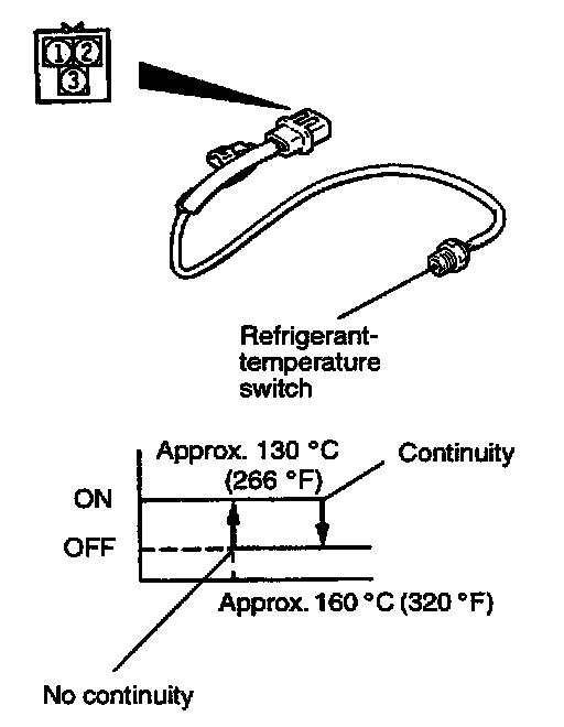 1. Immerse the refrigerant-temperature switch in engine oil.2. Use an ohmmeter to check the continuity between the terminals 1 or 2 when the engine oil has become heated.