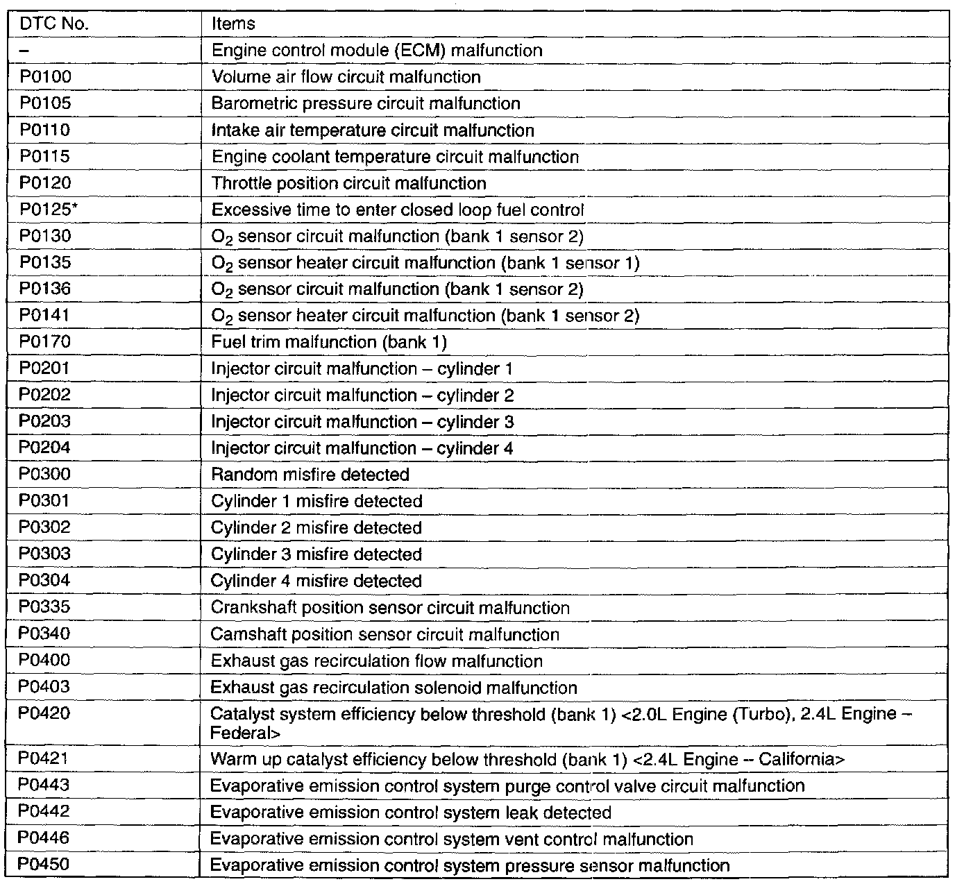 However, for items marked with a "*" the Malfunction Indicator Lamp illuminates on the first detection of the malfunction.