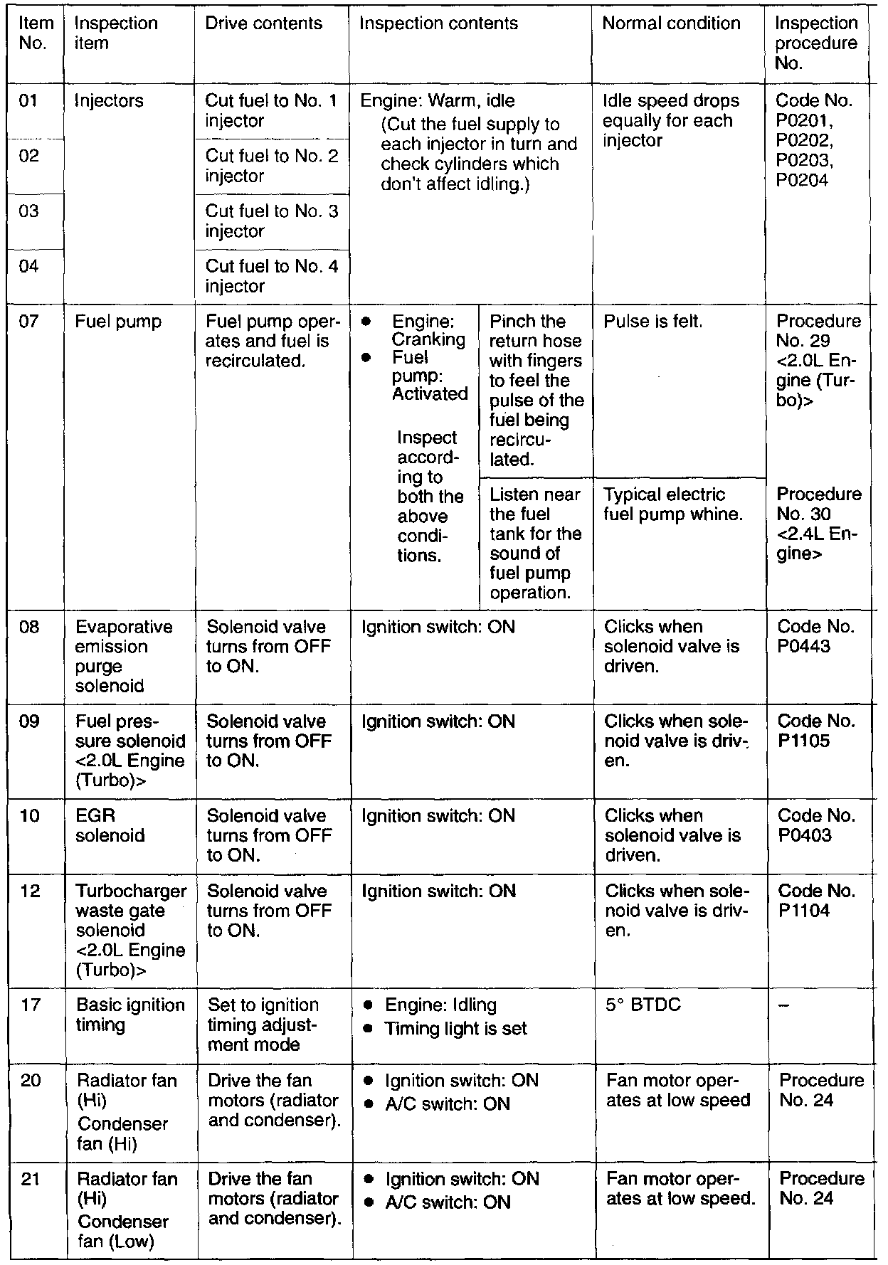 Actuator Test Reference Table