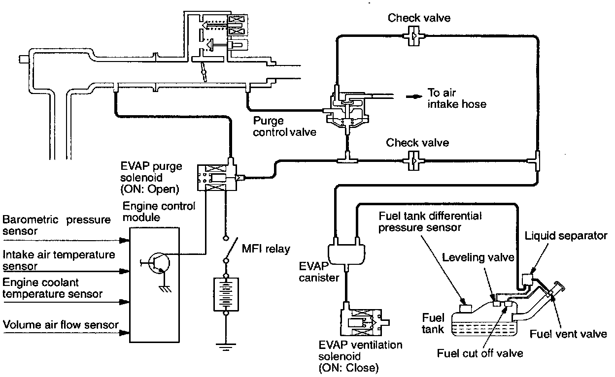 Fuel vapors from the fuel tank flow through the fuel tank pressure control valve and vapor pipe~hose to be stored temporarily in the EVAP canister. When driving with a low to medium load (including while idling) on the engine, the fuel vapor absorbed by the EVAP canister is drawn into the intake manifold plenum.