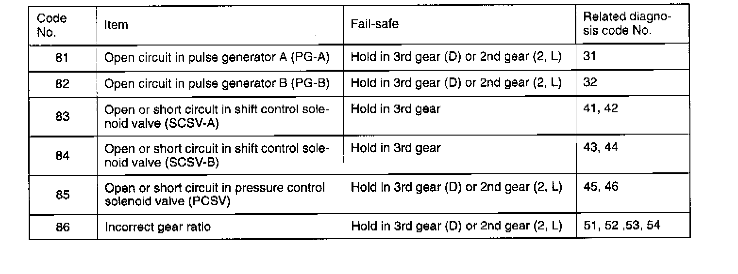 In addition, fail-safe codes lock the transaxle in 3rd or 2nd gear. Fail-safe will be canceled if the ignition switch is turned to OFF. The diagnostic trouble codes will remain.