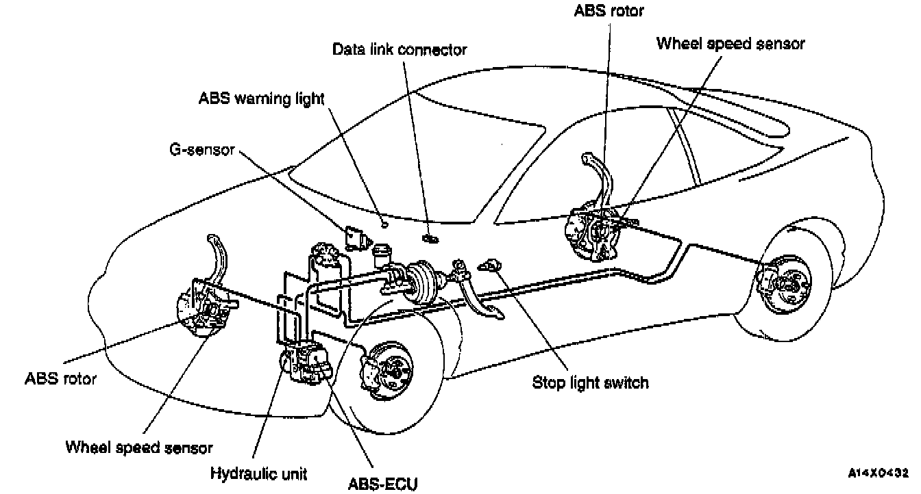 GENERAL INFORMATIONThe ABS consists of wheel speed sensors, stop light switch, hydraulic unit and the ABS-ECU. If a problem occurs in the system, the malfunctioning system can be identified by means of the diagnostic function, and the trouble symptom memory will not be erased even if the ignition switch is turned to OFF. In addition, reading of diagnostic trouble codes and service data and actuator testing are possible using the scan tool.