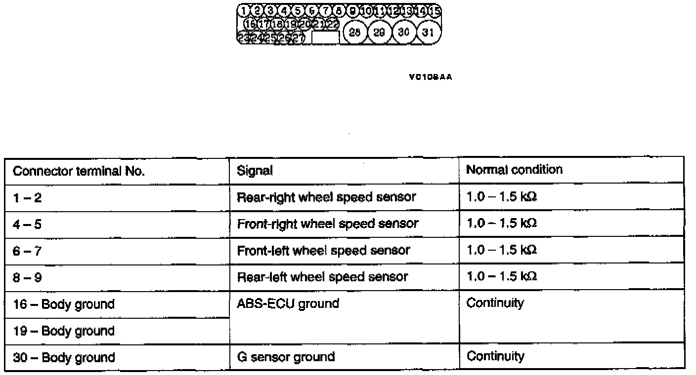 1. Turn the ignition switch off and disconnect the ABS-ECU connectors before checking resistance and continuity.