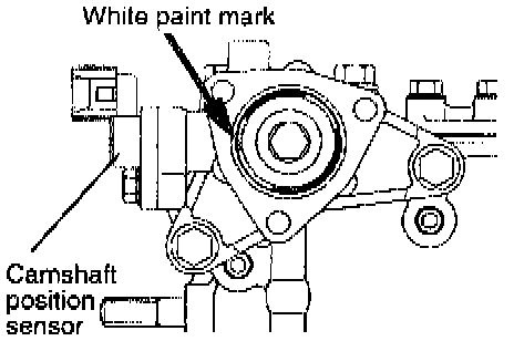 2. Install the camshaft position sensing cylinder so that the white paint mark is facing in the direction shown in the illustration.