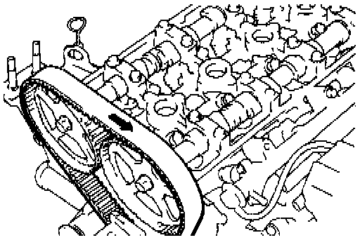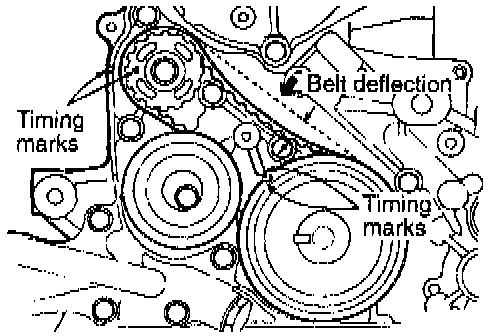 6. Press with index finger the center of span on tension side of timing belt "B". The bell: must deflect 5 - 7 mm (0.20 - 0.28 inch).