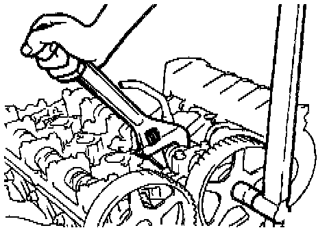 14. Install the special tools, Socket Wrench and Torque Wrench, on the tensioner pulley, and loosen the tensioner pulley center bolt.
