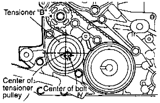 3. Make sure that the relationship between the tensioner pulley center and the bolt center is as shown in the illustration.