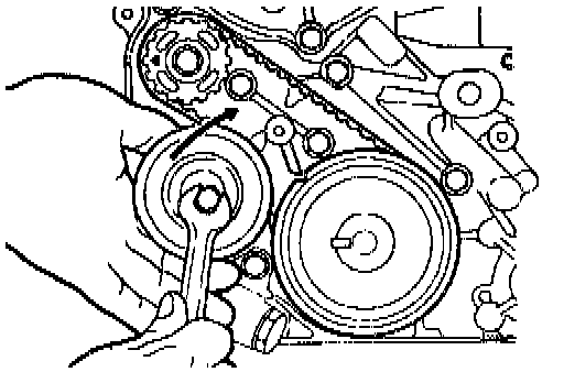 4. Move the tensioner "B" in the direction of arrow while lifting with a finger to give a sufficient tension to the tension side of timing belt. In this condition, tighten bolt to secure tensioner "B". When the bolt is tightened, use care to prevent shaft from turning together. If shaft is turned together, belt will be over tensioned.
