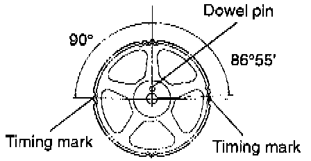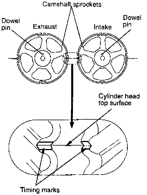 1. Turn the two sprockets so that their dowel pins are located on top. Then, align the timing marks facing each other with the top surface of the cylinder head. When you let go of the exhaust camshaft sprocket, it will rotate one tooth counterclockwise. This should be taken into account when installing the timing belt on the sprockets.