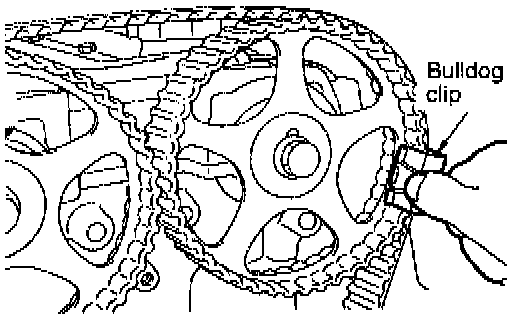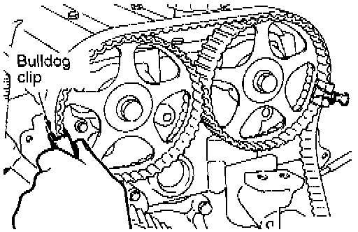 5. Thread the timing belt over the intake side camshaft sprocket and fix it at indicated position by a bulldog clip.