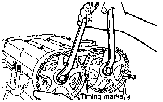 6. Thread the timing belt over the exhaust side sprocket, aligning the timing marks with the cylinder head top surface using two wrenches.