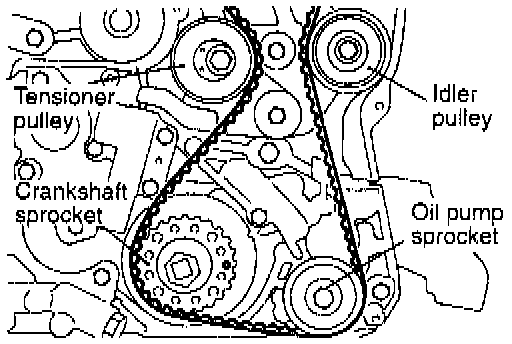 1. Water or oil on the belt shortens its life drastically, so the removed timing belt, sprocket, and tensioner must be free from oil and water. These parts should not be washed. Replace parts if seriously contaminated.