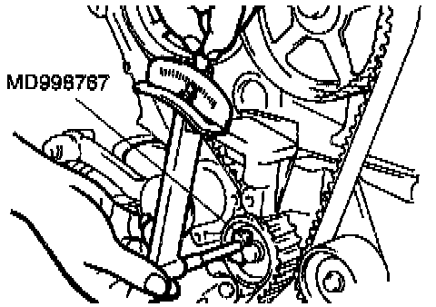 16. Holding the tensioner pulley with the special tool and torque wrench, tighten the center bolt to specification.
