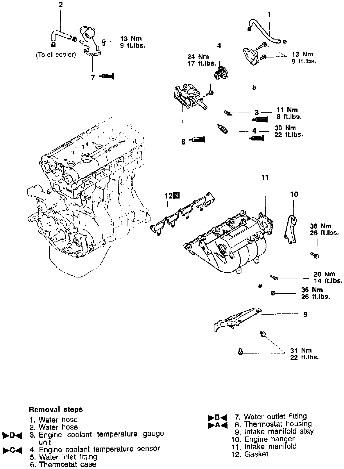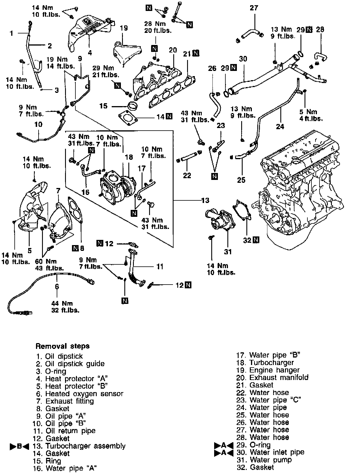 2. Tighten the turbocharger mounting bolts and nuts to 27 - 31 Nm (20 - 22 ft. lbs.).