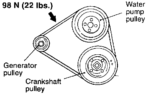 Use the belt tension gauge to check belt tension at the shown point or check deflection by applying 98 Nm (22 lbs.) to the shown point.