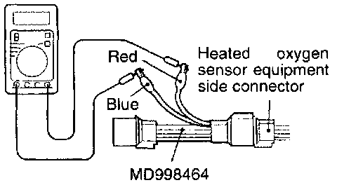 2. Make sure that there is continuity 11 - 18 ohms at 20°C (68°F) between terminal 1 (red clip of special tool) and terminal 3 (blue clip of special tool) on the heated oxygen sensor connector.