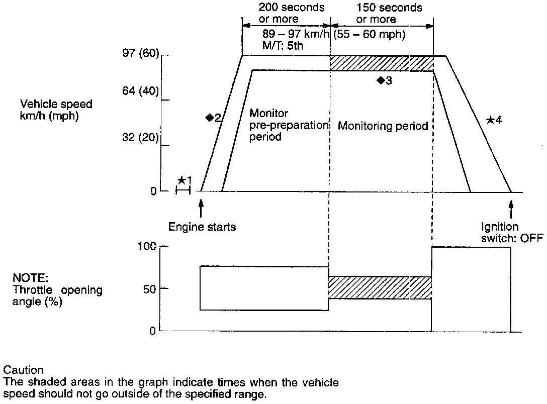 *2: Monitor pre-preparation period: start the engine and accelerate to a speed of between 89 - 97 km/h (55 - 60 mph). Acceleration, deceleration and braking can be carried out during this period. Drive for 60 seconds or more while maintaining the vehicle speed at between 89 - 97 km/h (55 - 60 mph).