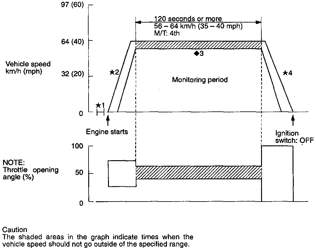 +3: Monitoring period: drive for 120 seconds or more while maintaining the throttle opening angle at a constant angle (keeping throttle variations as small as absolutely possible) and the vehicle speed at between 56 - 64 km/h (35 - 40 mph). Drive as consistently as possible during this time, without making any sudden steering wheel movements.