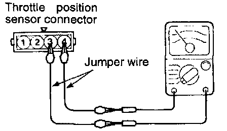 2. Connect an ohmmeter between terminal 3 (closed throttle position switch) and 4 (sensor ground) by using jumper wires.