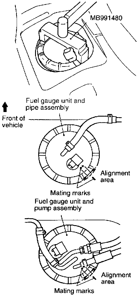 CAUTION: Make sure that the fuel gauge unit and pump assembly (or the fuel gauge unit and pipe assembly) does not turn together with the cap when tightening the cap. If the mating marks are not aligned, the position of the float will not be correct and the fuel gauge indicator light and the fuel level gauge will not operate properly.