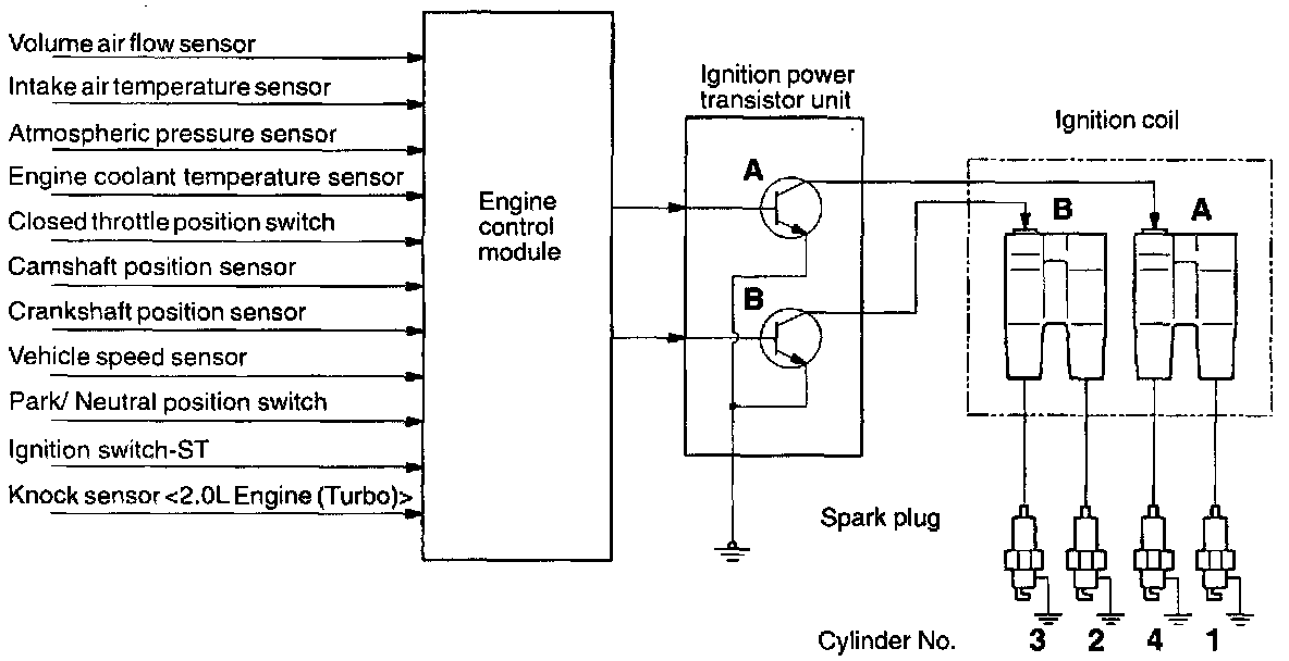 The engine control module controls the two ignition power transistors (A and B) to turn them alternately ON and OFF. This causes the primary' currents in the ignition coils (A and B) to be alternately interrupted and allowed to flow to fire the cylinders in the order 1-3-4-2.