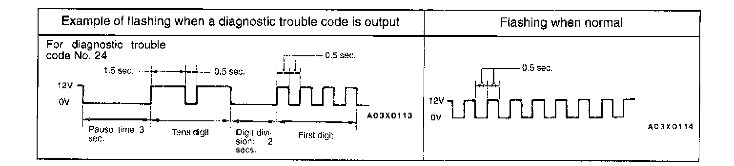 DIAGNOSTIC RESULT DISPLAY METHOD WHEN USING THE CHECK ENGINE/MALFUNCTION INDICATOR LAMPNOTE: Other diagnostic trouble codes also output as the same code numbers as when using the scan tool.