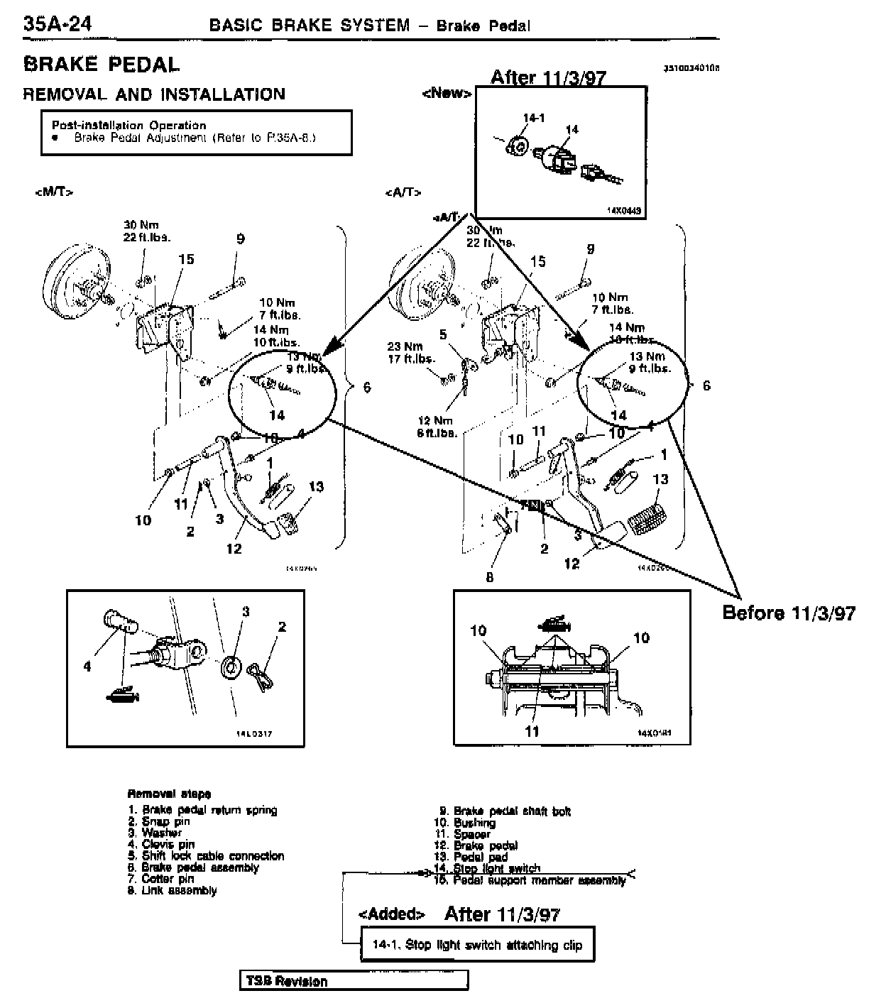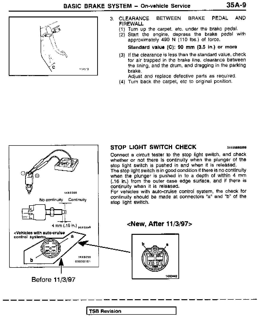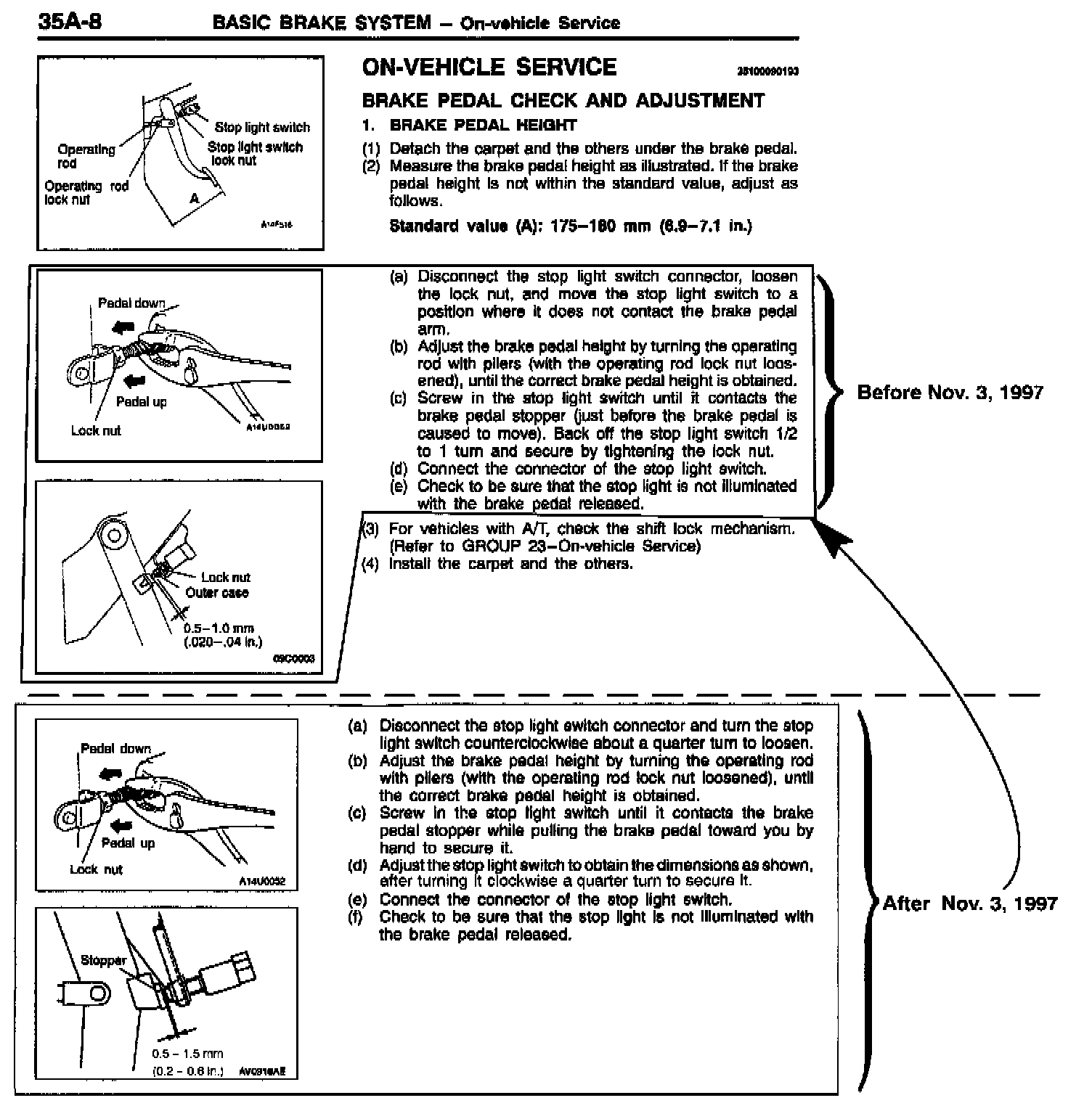 Beginning with November 3, 1997 production, the stop light switch on affected vehicles was changed from a switch mounted with a securing nut to one that is mounted with a securing clip. The relevant service procedures are changed. This bulletin has new information relating to the new-type switch.