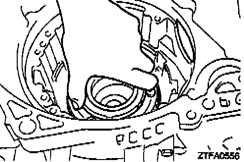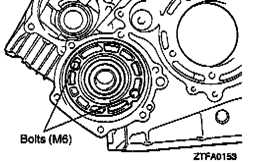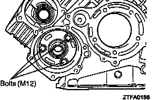 57. Remove the front bearing retainer mounting bolt (M10). Then, screw a bolt (M12) into the threaded hole of the front bearing retainer and, holding that bolt, remove the front bearing retainer and outer race.