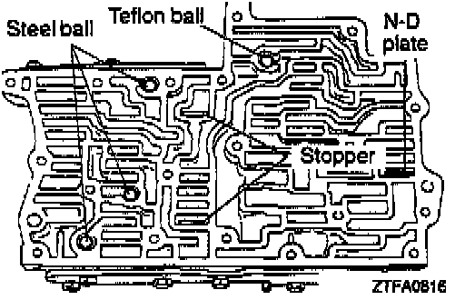 1. Install the stopper plates, N-D plate, teflon ball, and steel balls into the upper valve body as shown.