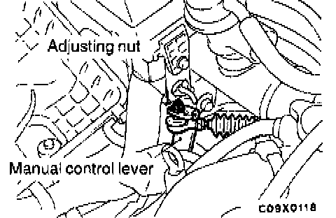 2. Loosen the adjusting nut, gently pull the transaxle control cable in the direction of the arrow and tighten the nut.