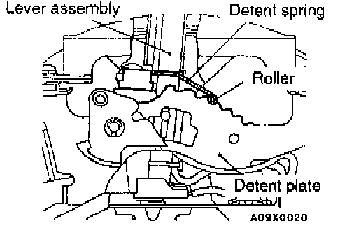 Shift the selector lever to the neutral (N) position, and then install the detent spring assembly so that the roller is in the detent plate groove.