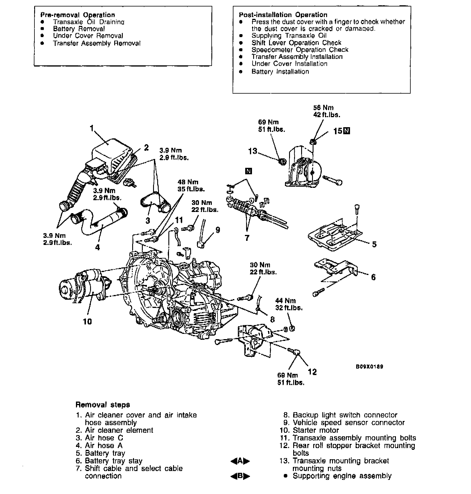 Jack up the transaxle assembly gently with a garage jack, and then remove the transaxle mounting bracket nuts.