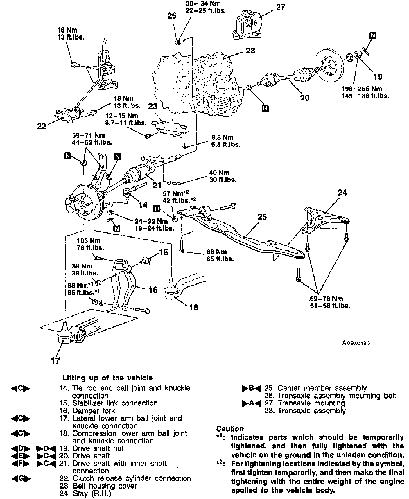 CAUTION: Before securely tightening the drive shaft nuts, make sure there is no load on the wheel bearings.