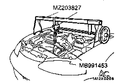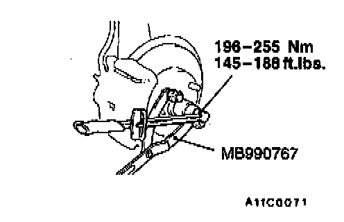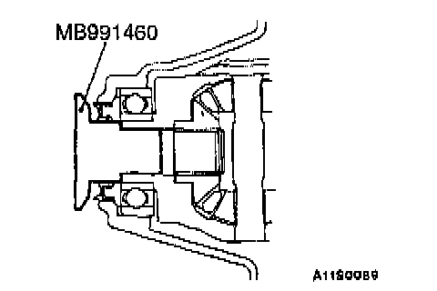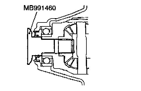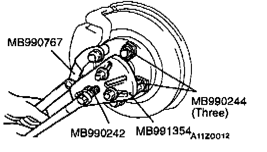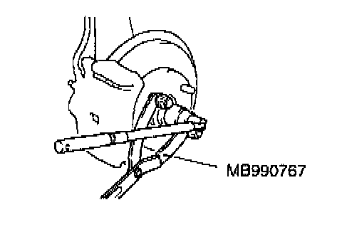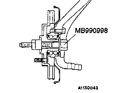 CAUTION: Do not apply the vehicle weight to the wheel bearing while loosening the drive shaft nut. If, however, the vehicle weight must be applied to the bearing (because of moving the vehicle), temporarily use the special tool MB990998, etc. to secure the wheel bearing.