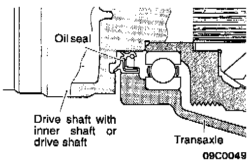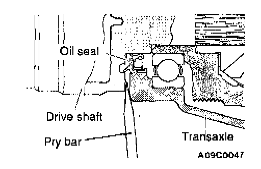 2. Insert a pry bar between the transaxle case and the drive shaft, and then pry the drive shaft from the transaxle.