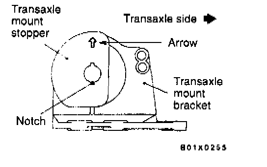 Align the notches on the stopper with the transaxle mount bracket with the arrow mark facing toward the shown direction. Then install the stopper.
