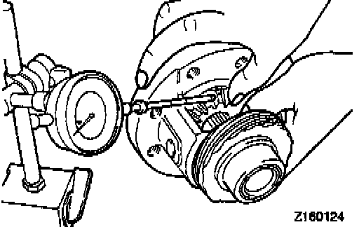3. Measure the backlash between the side gear and pinion gear. The backlash should be 0.025 to 0.150 mm (0.00098 to 0.00591 inch) and the right and left gear pairs should have equal backlash. If the backlash is not within the standard value, disassemble, and reassemble them using spacers selected for correct backlash.