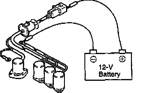 3. Connect a 12-V battery between the terminal and body of each solenoid valve and check the operating sound. The valve is okay if an operating sound is heard. No operating sound indicates that the valve is sticking or has accumulated foreign matter. In this case, replace the solenoid valve assembly.