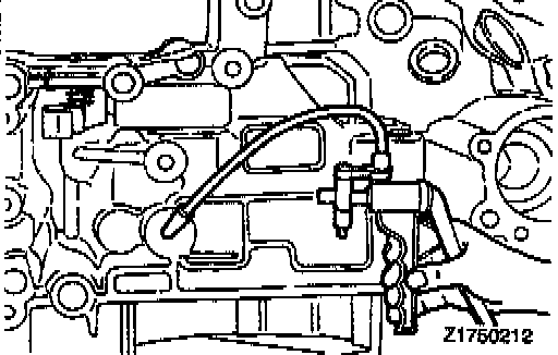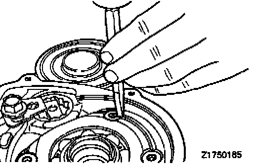 i. Using a hand pump, feed air through the location shown and, at the same time, read the dial indicator and select a pressure plate to obtain the specified end play.