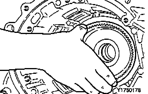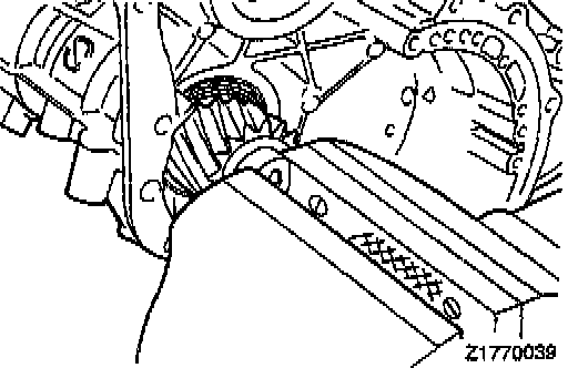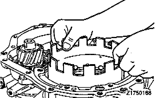 12. Insert the output flange in position (with two ball bearings and transfer drive gear attached) from the inside of the transaxle case.