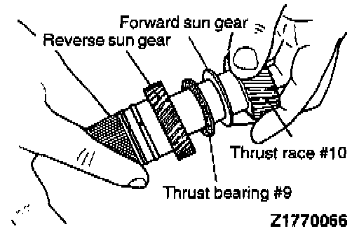 25. Attach thrust race #10 and thrust bearing #9 to the forward sun gear. Then, assemble the reverse sun gear.