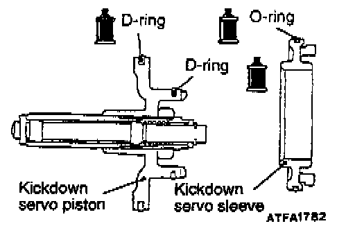 36. Install a new teflon seal ring and a new D-ring in the grooves of the kickdown servo piston, and apply automatic transmission fluid to the rings.
