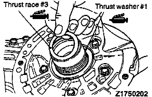 51. Attach thrust race #3 and thrust washer #1 on the rear end face of the oil pump with petrolatum jelly.