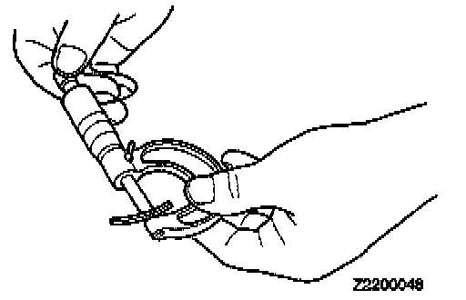 60. Measure the thickness of the flattened solder using micrometer. Add the measured solder thickness (T) to the value 0.38 mm (0.0150 inch), which corresponds to the gasket thickness. Then subtract from that sum a value corresponding to the specified end play. The result obtained is the thickness of the spacer to be selected. Select a spacer whose thickness falls within the range determined by the formulas below: