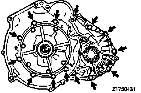 64. Install converter housing and tighten the 14 bolts indicated by arrows to the specified torque.