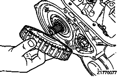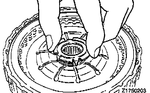 89. After applying automatic transmission fluid to the outside surface of the oil pump-side cylindrical portion of the torque converter, install the torque converter carefully so as not to give damage to the oil seal lip. Make certain that the torque converter is in mesh with the oil pump drive gear.
