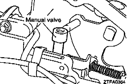 78. Install the valve body in the transaxle case while fitting the detent plate pin in the gap between the lands of the manual valve.