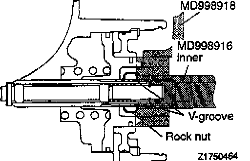 b. Loosen the lock nut until it is about to reach the V-groove in the adjusting rod. Tighten the special tool (inner) until it touches the lock nut.