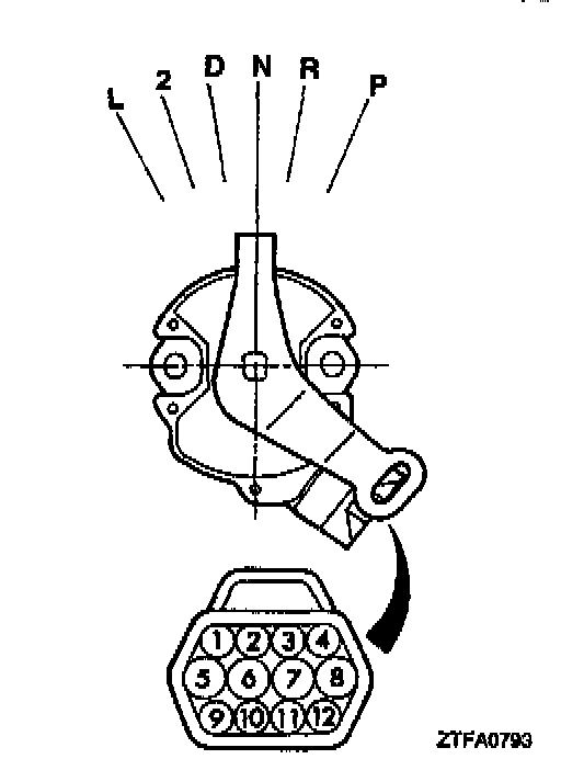 b. Turn the park/neutral position switch body until the 12 mm (0.47 inch) wide end of the manual control lever aligns with the switch body, flange [12 mm (0.47 inch) wide portion]. Alternatively, turn the switch body until the 5 mm (0.20 inch) hole in the manual control lever aligns with the 5 mm (0.20 inch) hole in the switch body.