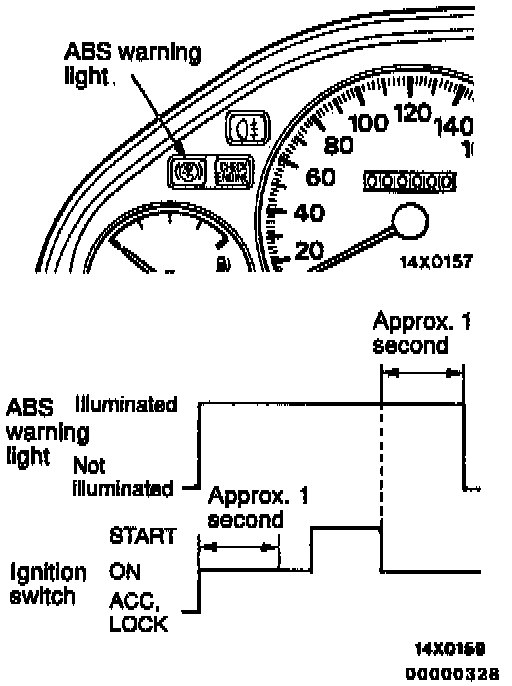 2. When the ignition switch is turned to "START" to start the engine, the ABS warning light switch off after approximately 1 second.